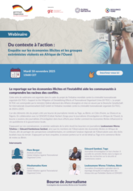 S’appuyant sur ces connaissances, ce premier webinaire de la série réunit les boursiers en journalisme Loukoumane Worou Tchehou et Edouard Kamboissoa Samboé, ainsi que les membres de l’Observatoire des économies illicites en Afrique de l’Ouest, afin de partager des perspectives complémentaires, en combinant l’analyse régionale de l’Observatoire avec des récits localisés issus du terrain. S’appuyant sur leurs enquêtes, la session portera sur le vol de bétail au Togo et le commerce illicite de motos au Bénin.