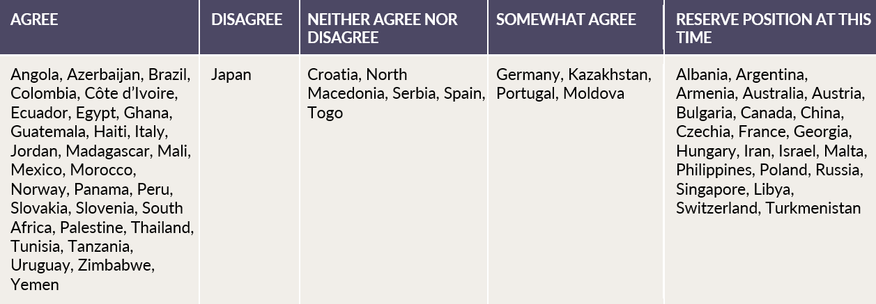 Throughout this period, momentum continued to build in favour of a new protocol. Indeed, the responses to an official questionnaire distributed to member states in early 2025 (last updated in January 2026) revealed a greater degree of openness than outright opposition (see table).
