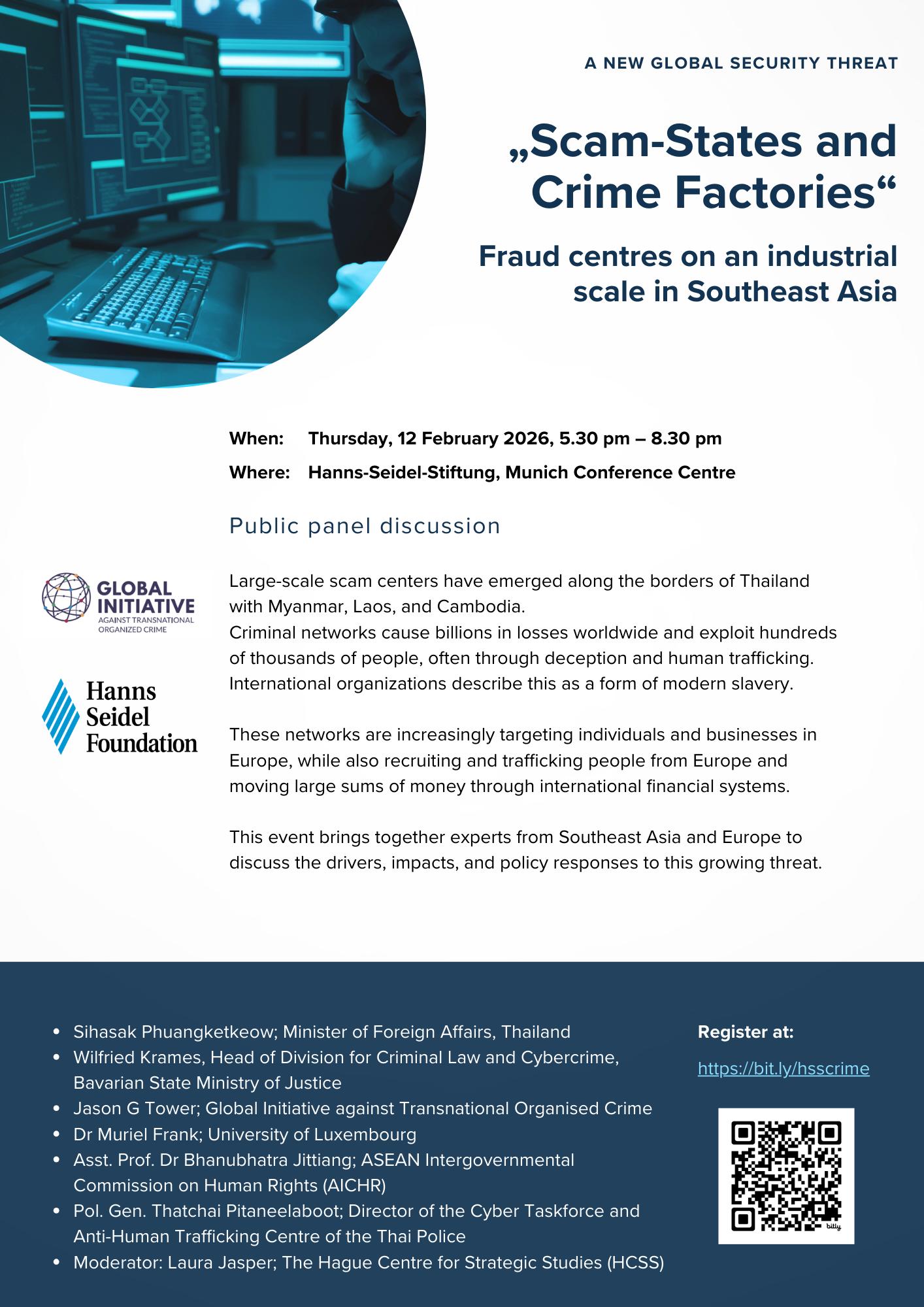 Convened by the Global Initiative Against Transnational Organized Crime (GI-TOC) and the Hanns Seidel Foundation, the public panel discussion “Scam-States and Crime Factories” brings together experts from Southeast Asia and Europe to examine the rapid growth of industrial-scale scam centres, their links to human trafficking and illicit financial flows, and the policy responses needed to address this expanding threat. For full details, speakers, and registration info, see the flyer.
