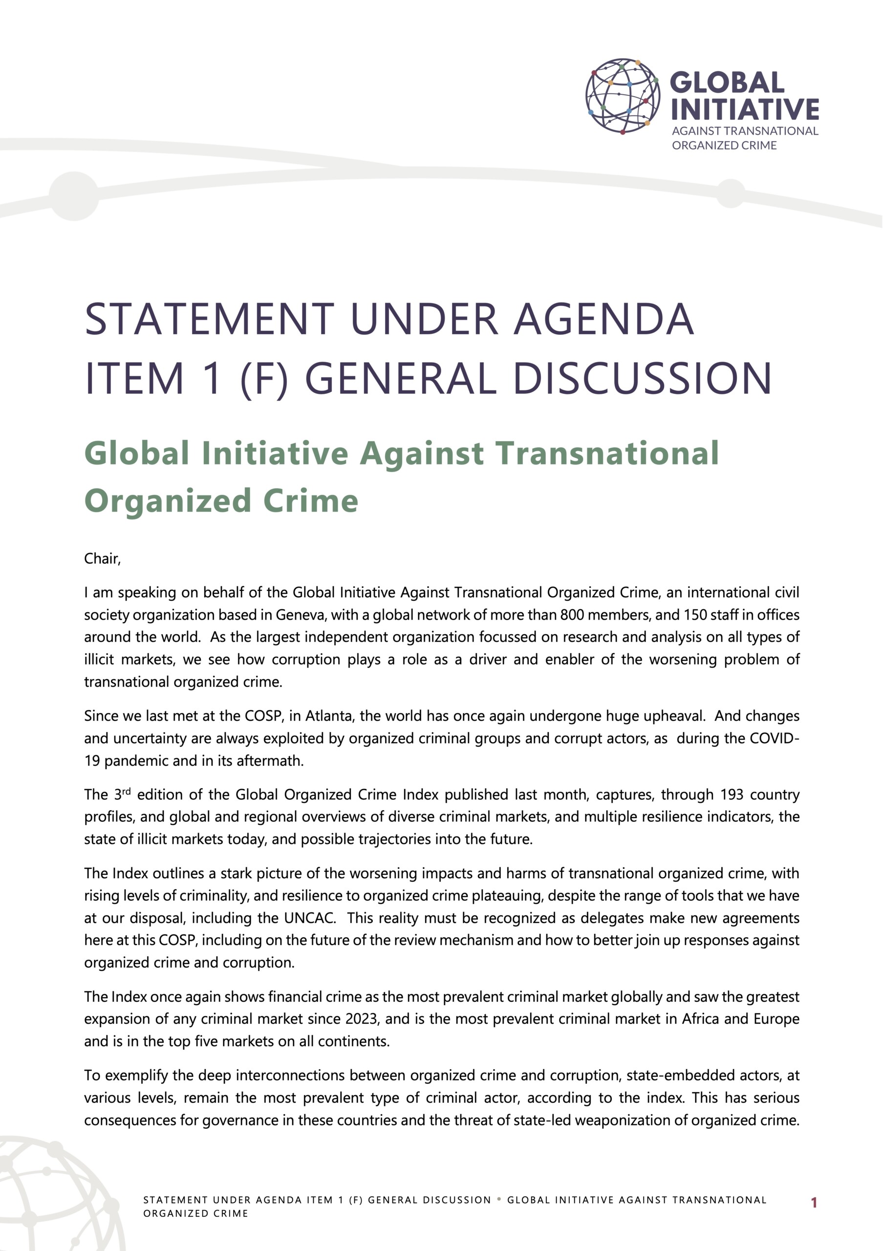 The day before, on 16 December, Tennant delivered the GI-TOC’s plenary statement, outlining the Index’s findings on corruption and emphasizing the need for greater civil society engagement in the UNCAC and UNTOC review processes.